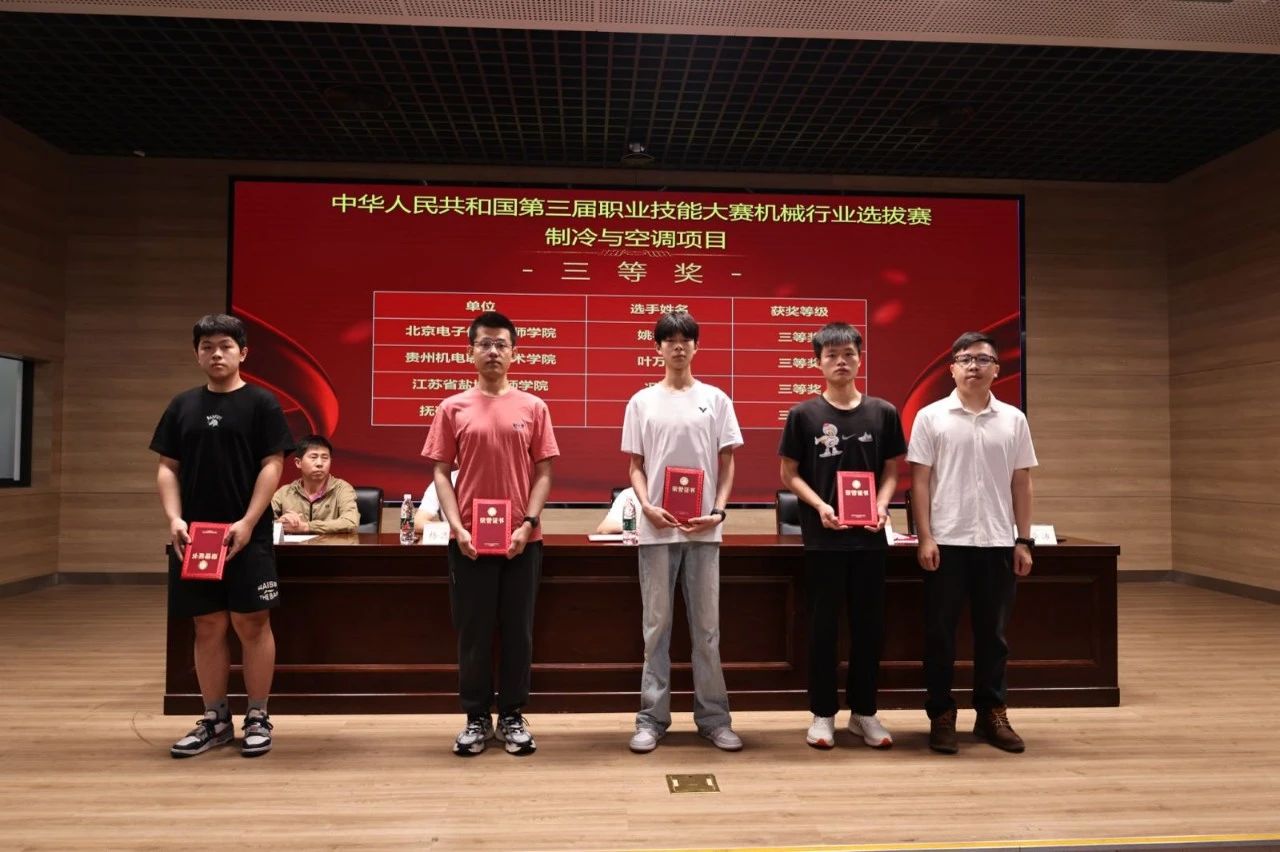 闭赛仪式上,杨逸春书记代表承办方致辞。裁判长徐立山宣读了比赛成绩,与会领导为获奖选手和优秀教练、优秀合作企业、突出贡献单位颁发了证书和奖牌。刘加勇处长代表本次选拔赛组委会讲话。他向服务大赛的承办单位、技术支持单位及相关工作人员表示感谢,并对大赛承办工作予以肯定。刘加勇处长指出,制造业是强国之基,技能人才则是推动行业高质量发展的关键力量。本次比赛的成功举办为制冷与空调领域的高技能人才搭建了展示平台,在赛场上全国各地选手们展现出了精湛的技艺与良好的精神风貌。他希望各参赛单位充分发挥技能竞赛的引领作用,促进高技能人才的培养;同时希望参赛选手珍惜荣誉、再接再厉,共同为“技能强国”“制造强国”贡献力量。