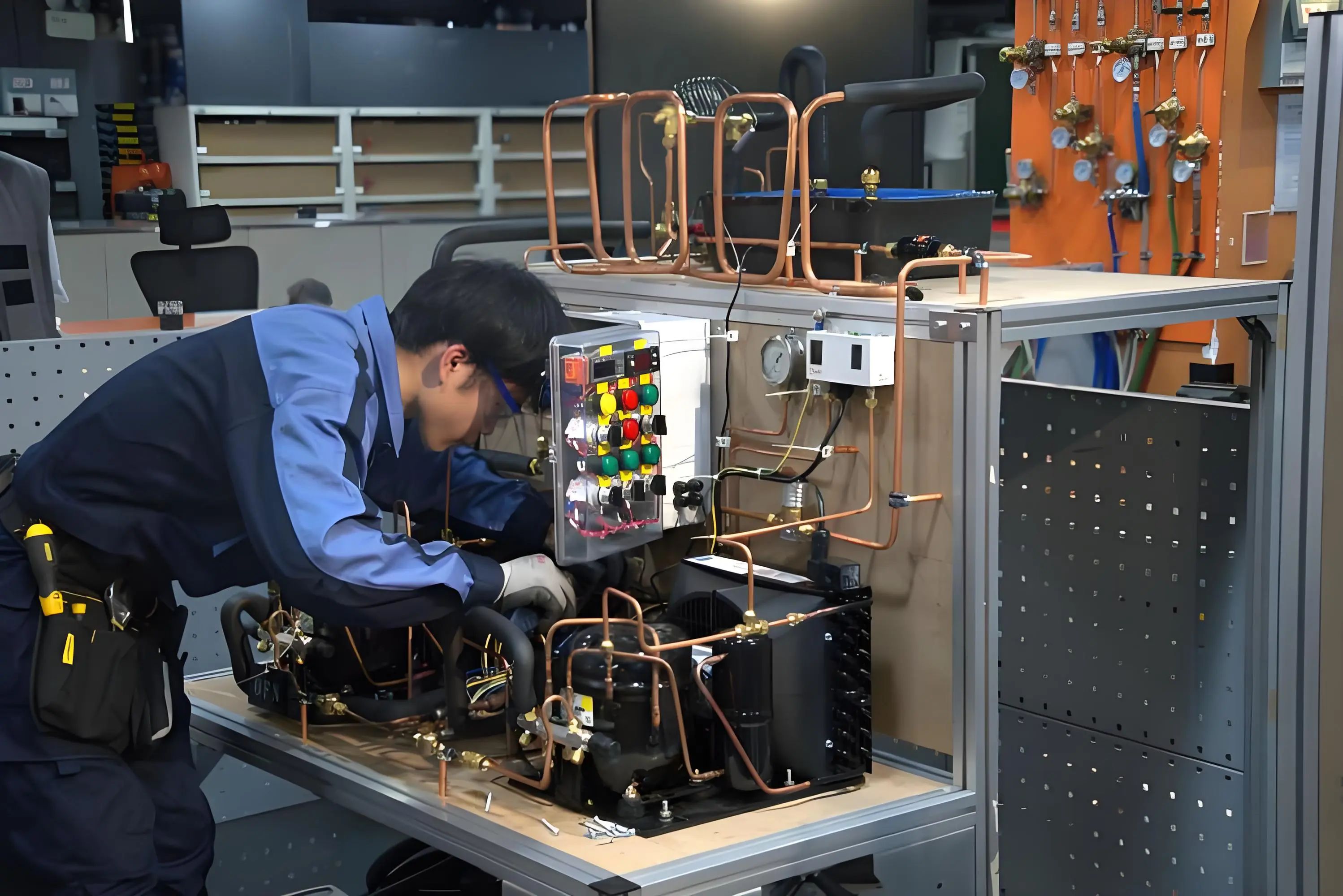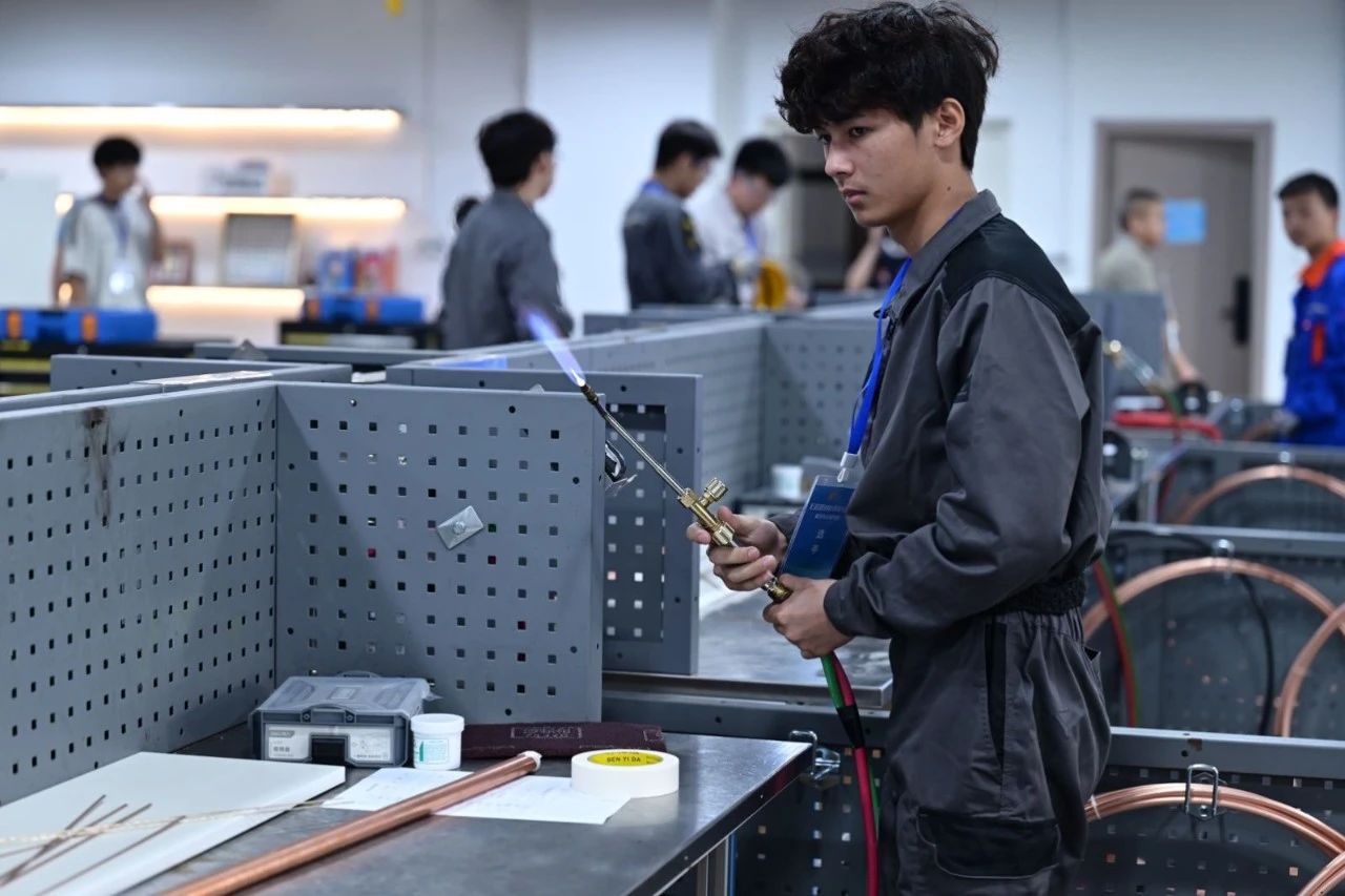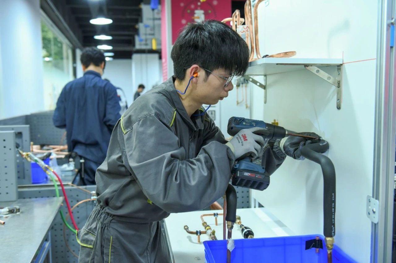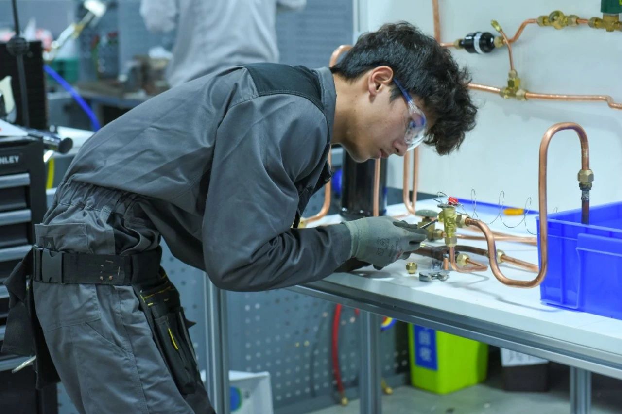 制冷与空调赛项聚焦现代制冷技术核心能力,要求选手独立完成制冷组件制作、系统集成安装及全流程调试测试。项目深度融合产业实践标准,严格遵循世赛职业安全规范与环保要求,通过模拟真实制冷设备从零部件生产到整机调试的全流程任务,全面考察选手的管路钎焊精度、电气安全控制、故障诊断及系统优化能力。该赛项精准对接制冷行业智能化、绿色化发展趋势,旨在培养具备规范操作意识、复杂问题解决能力和节能减排技术素养的高技能人才,为制冷设备制造与维保领域输送复合型技术骨干。